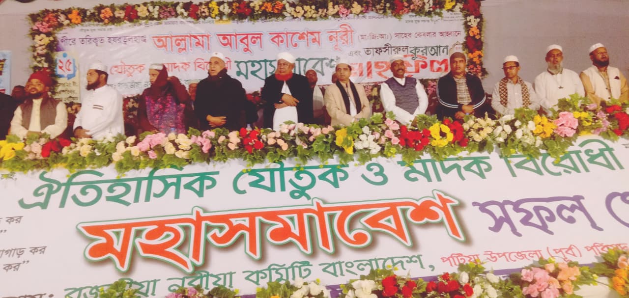 A huge anti-dowry and anti-drug gathering, Tafsirul Quran Mahfil 25, was held yesterday at the Patiya Adarsh High School ground under the initiative of Anjumane Rajviya Nooriya Committee Bangladesh Patiya Upazila Purba Parishad at the call of Pir-e-Tariqtva Allama Abul Kashem Noori Maddazilluhul Ali.