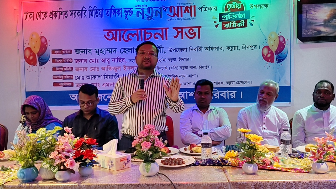 A discussion meeting was held on the occasion of the 3rd founding anniversary of the national daily Notun Asha Patrika, which is included in the list of government media published from Dhaka. The discussion meeting was organized at 3 pm on Monday, September 29, in the hall of the Kachua Municipality Tripti Restaurant in Kachua Upazila. Kachua Upazila Executive Officer Md. Helal Chowdhury was present as the chief guest.