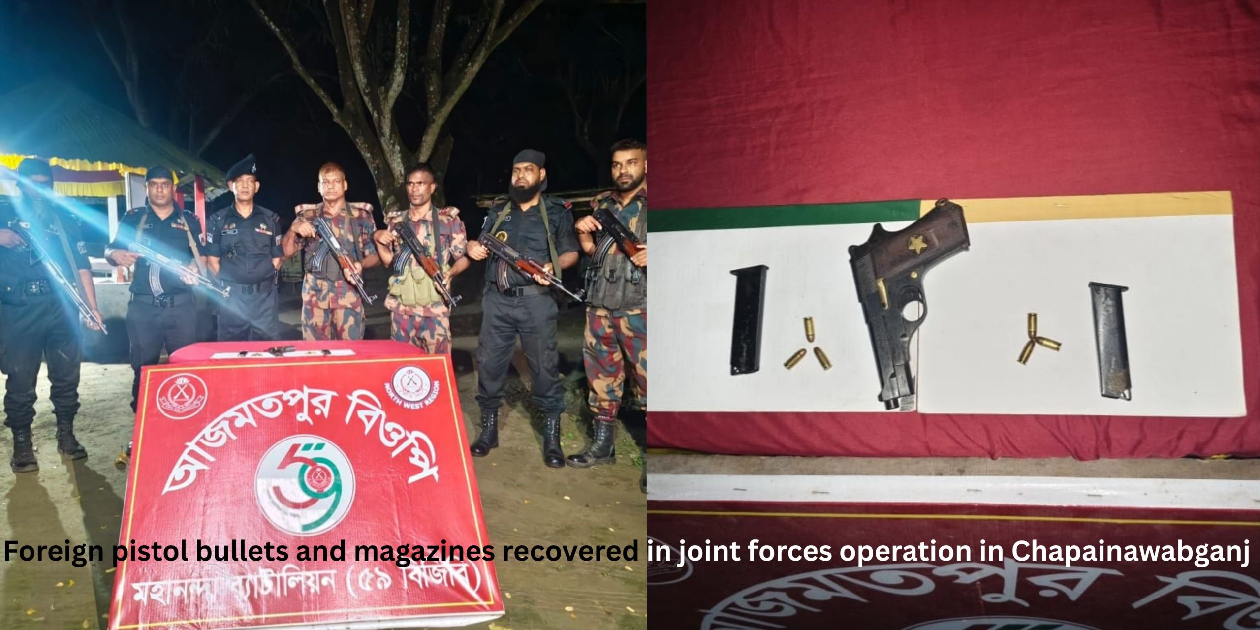 A joint operation at the Azmatpur border of Chapainawabganj has recovered 01 foreign pistol, 06 rounds of bullets and 02 magazines.