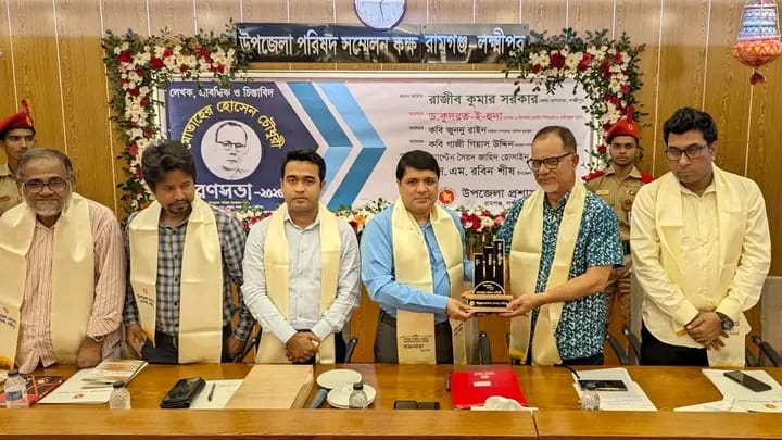 On the occasion of the memorial meeting of Motaher Hossain Chowdhury, a prominent essayist of Bengali literature and a pioneer of free thought, Lakshmipur District Commissioner Rajib Kumar Sarkar handed over the posthumous award to the writer's son Captain Syed Zahid Hossain.