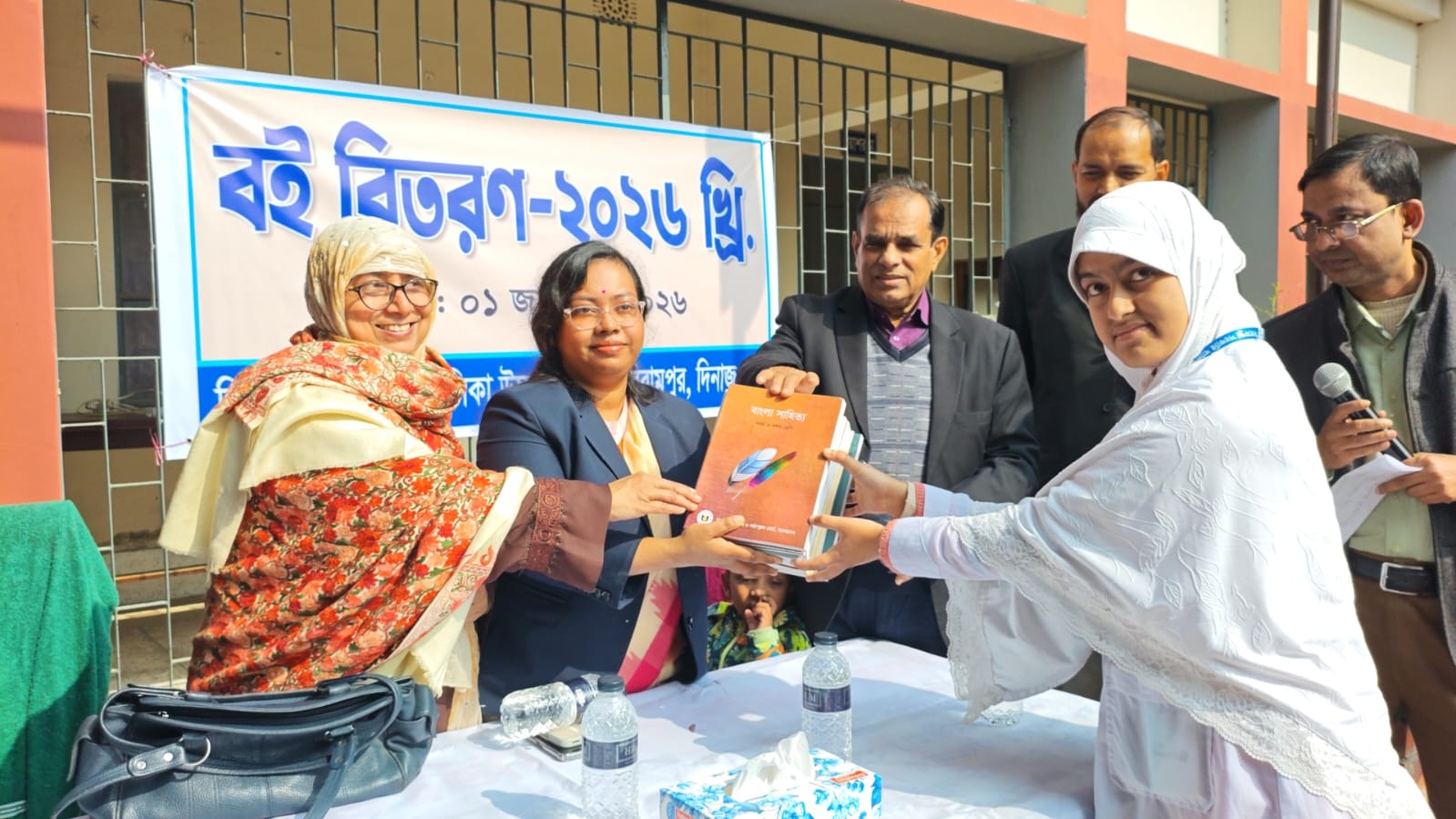On Thursday (January 1), at 11:30 am, Upazila Executive Officer Tahmina Sultana Nila officially distributed new books to the students of Birampur Government Girls High School and Government Primary School No. 2. The excited faces of the students upon receiving the books, the sparkle of joy in their eyes—all combined to create an emotional and festive atmosphere.