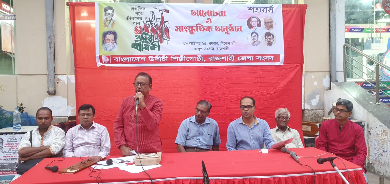 Then, under the chairmanship of Udichi Rajshahi District Sangsad President Zulfikar Ahmed Golap and moderated by General Secretary Shahinur Rahman Sona, freedom fighter Shajahan Ali Barjahan, People's Solidarity Movement Rajshahi District Convener Advocate Murad Morshed, labor leader Comrade Humayun Reza Jenu, Charan Cultural Center Rajshahi organizer Shamsul Abedin Don, and Udichi Rajshahi Vice President Ajit Kumar Mondal spoke in the discussion meeting.