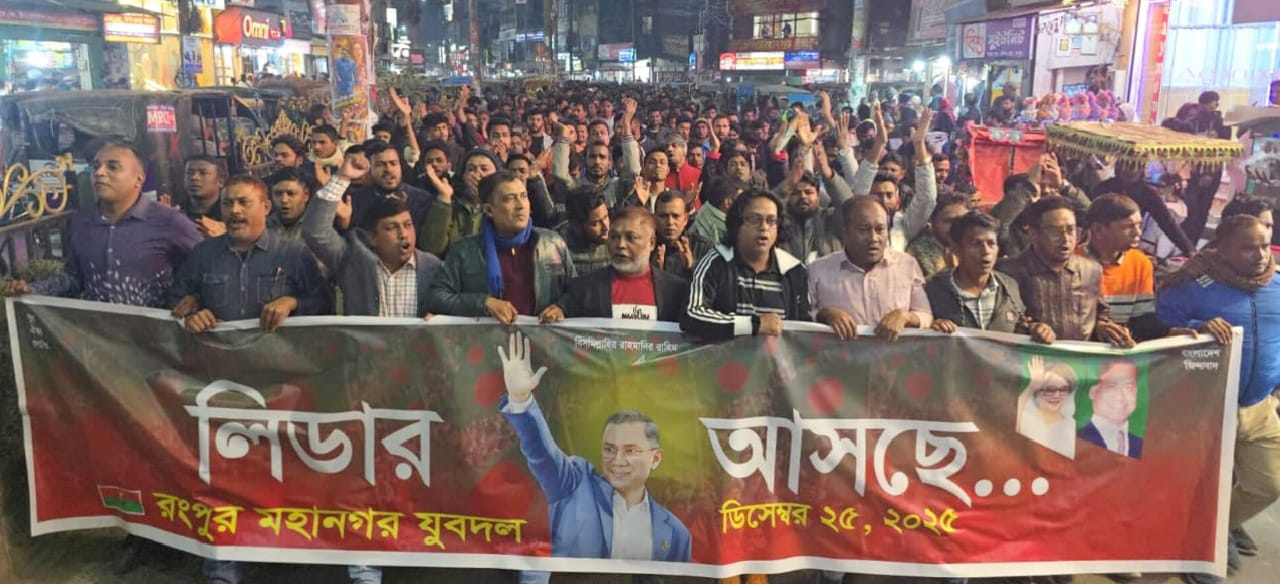 The Metropolitan Jubo Dal held a welcome procession in Rangpur on the occasion of the return of BNP Acting Chairman Tarique Rahman. On Thursday evening, the procession, with the participation of leaders and workers from 33 wards of the city, started from the Town Hall premises and circled the main roads of the city.